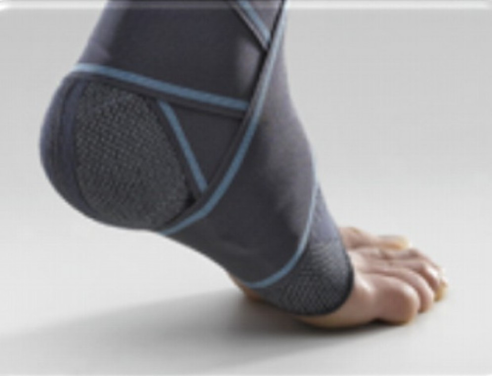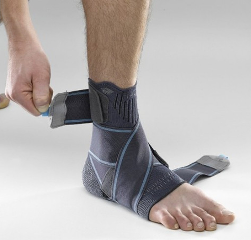 Az első pántcsíkot tekerje a boka köré és a csík tövénél rögzítse tépőzárral. Ugyanezt a műveletet végezze el a másik pántcsíkkal is. A bokát laterálisan szorosan kell megtámasztani úgy, hogy a flexiót-extensiót ne gátoljuk.